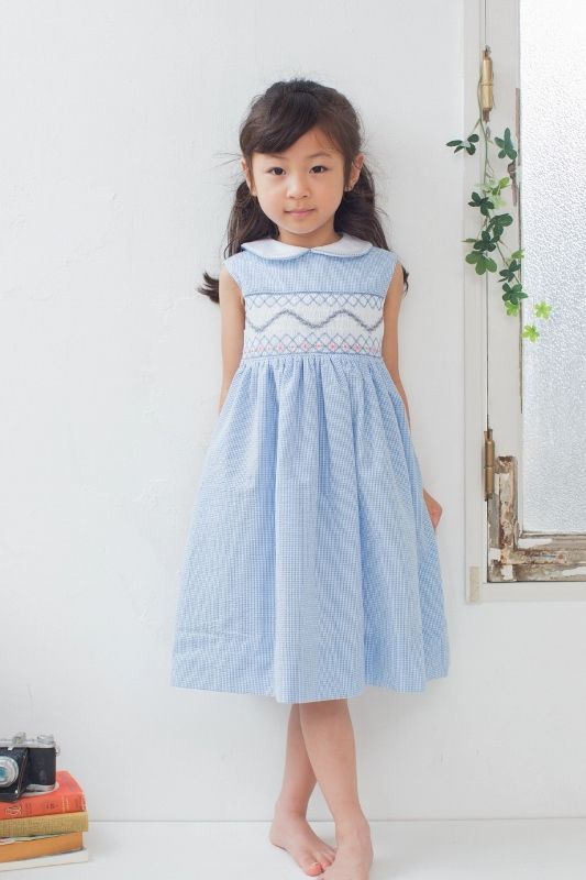 お花が可憐なスモッキングワンピース(サッカーブルーチェック)