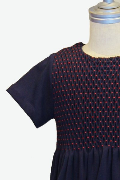 秋冬ジャージ素材スモッキングワンピース(半袖ネイビー)