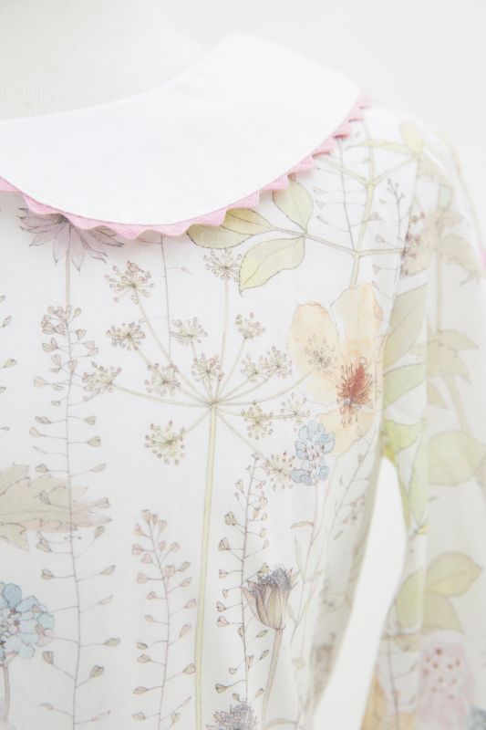 ピーターパンカラーにリバティプリントに合わせたお色のパイピングテープをつけております。